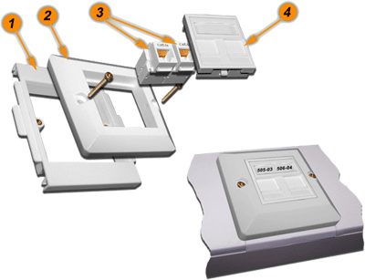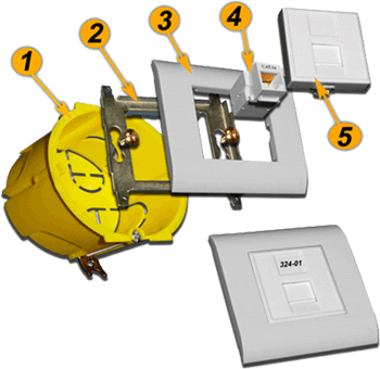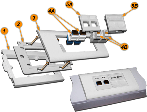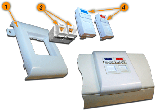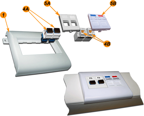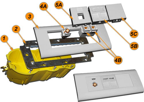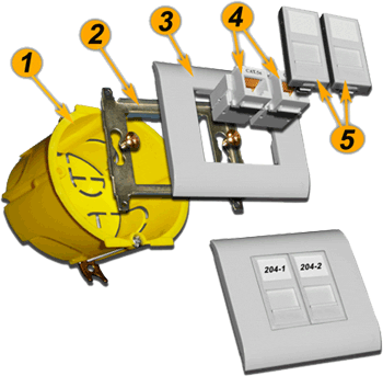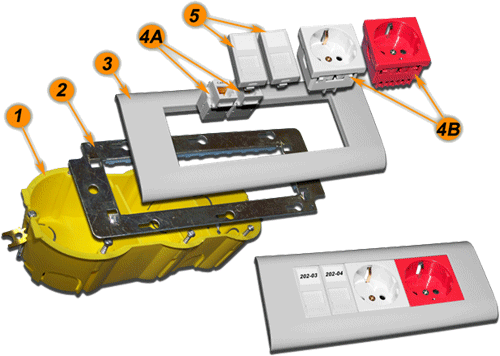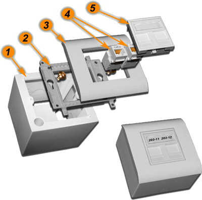 | №№ | Артикул | Наименование | Количество в сборке | | 1 | TWT-BX45x135-YL | Подрозеточная коробка в стену для суппорта 45х135, желтая | 1 | | 2 | LAN-MF45x135 | Металлический суппорт для установки рамки 45х135 | 1 | | 3 | LAN-FR45x135-WH | Лицевая рамка, французский стандарт, 45х135, белая | 1 | | 4A | LAN-OK45U5E/90-WH | Модуль Keystone, RJ45, кат.5E, UTP, 90 градусов, белый | 2 | | 4B | NM-EL45x45/T-XX | Лицевая панель электрической розетки Mosaic 45x45, нем. ст., 2K+3, со шторками, 45х45 (xx-код цвета) | 2 | | 5 | LAN-SIP-22N-WH | Вставка для модуля Keystone без шторок, 22,5х45, белая | 2 | |