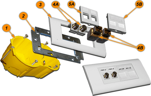 | №№ | Артикул | Наименование | Количество в сборке | | 1 | TWT-BX45x90-YL | Подрозеточная коробка в стену для суппорта 45х90, желтая | 1 | | 2 | LAN-MF45x90 | Металлический суппорт для установки рамки 45х90 | 1 | | 3 | LAN-FR45x90-WH | Лицевая рамка, французский стандарт, 45х90, белая | 1 | | 4A | TWT-OK-TV/F | Модуль Keystone с F-адаптером | 2 | | 4B | LAN-OK45S6/180 | Модуль Keystone, RJ45, кат.6, STP, 180 градусов | 2 | | 5A | LAN-SIP-24R-WH | Вставка на 2модуля Keystone без шторок, 45х45, белая | 1 | | 5B | LAN-SIP-24N-WH | Вставка на 2модуля Keystone с маркировкой и шторками, 45х45, белая | 1 | Телекоммуникационная розетка 2 порта UTP, порт BNC и заглушка для установки в стену.