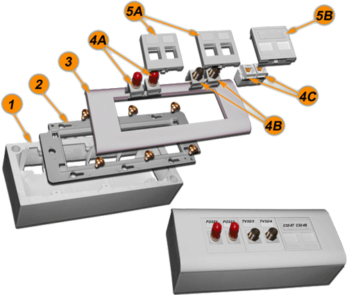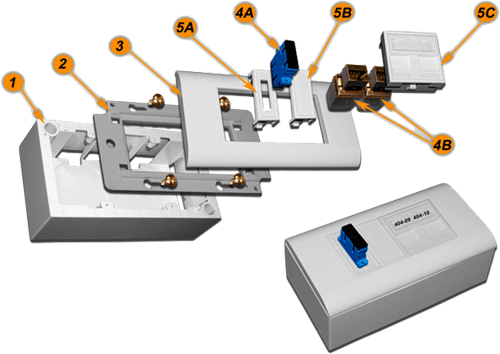 | №№ | Артикул | Наименование | Количество в сборке | | 1 | LAN-WB45x90-WH | Настенная коробка на стену для суппорта 45х90, белая | 1 | | 2 | LAN-PF45x90 | Пластиковый суппорт для установки рамки 45х90 | 1 | | 3 | LAN-FR45x90-WH | Лицевая рамка, французский стандарт, 45х90, белая | 1 | | 4A | LAN-2SC-AM-MM | Дуплексный адаптер SC, многомодовый | 1 | | 4B | LAN-OK45S6/180 | Модуль Keystone, RJ45, кат.6, STP, 180 градусов | 2 | | 5A | LAN-SIP-2SC-WH | Вставка под дуплексный оптический адаптер, 22,5х45, белая | 1 | | 5B | LAN-SIP-22B-WH | Заглушка 22,5х45, белая | 1 | | 5C | LAN-SIP-24N-WH | Вставка на 2модуля Keystone с маркировкой и шторками, 45х45, белая | 1 | Телекоммуникационная розетка 2 порта UTP , 2 порта F/TV и 2 разъема ST для установки на стену.