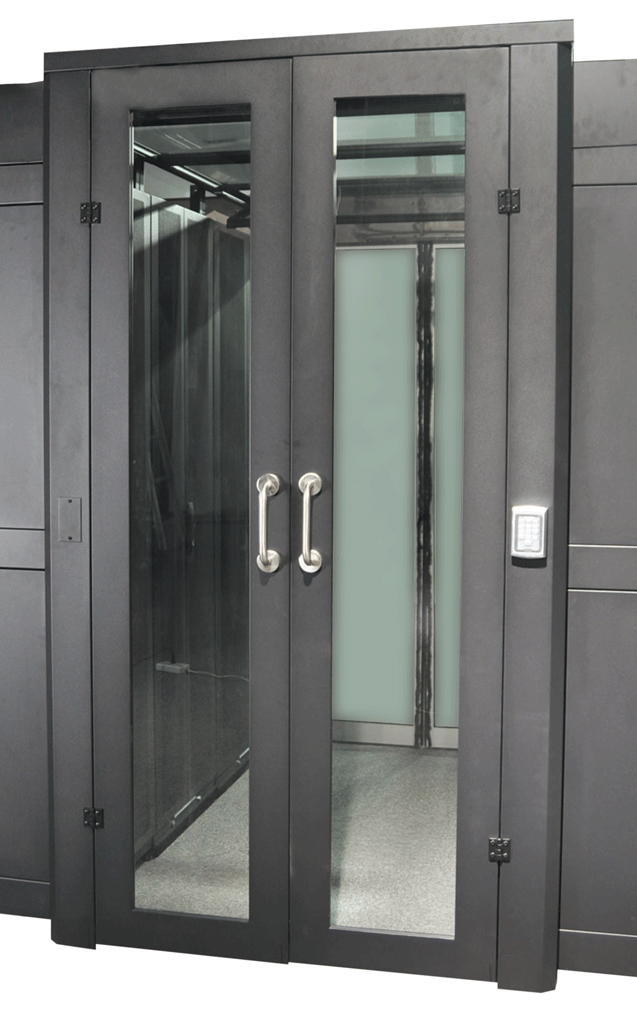 | Комплект дверей устанавливается между крайними шкафами в рядах для образования изолированного коридора. Стандартные двери используются для коридора шириной 1200 мм, под заказ возможно изготовление дверей другой ширины.Светопроницаемые стеклянные окна в панелях дверей позволяют осуществлять визуальный контроль ситуации внутри коридора.