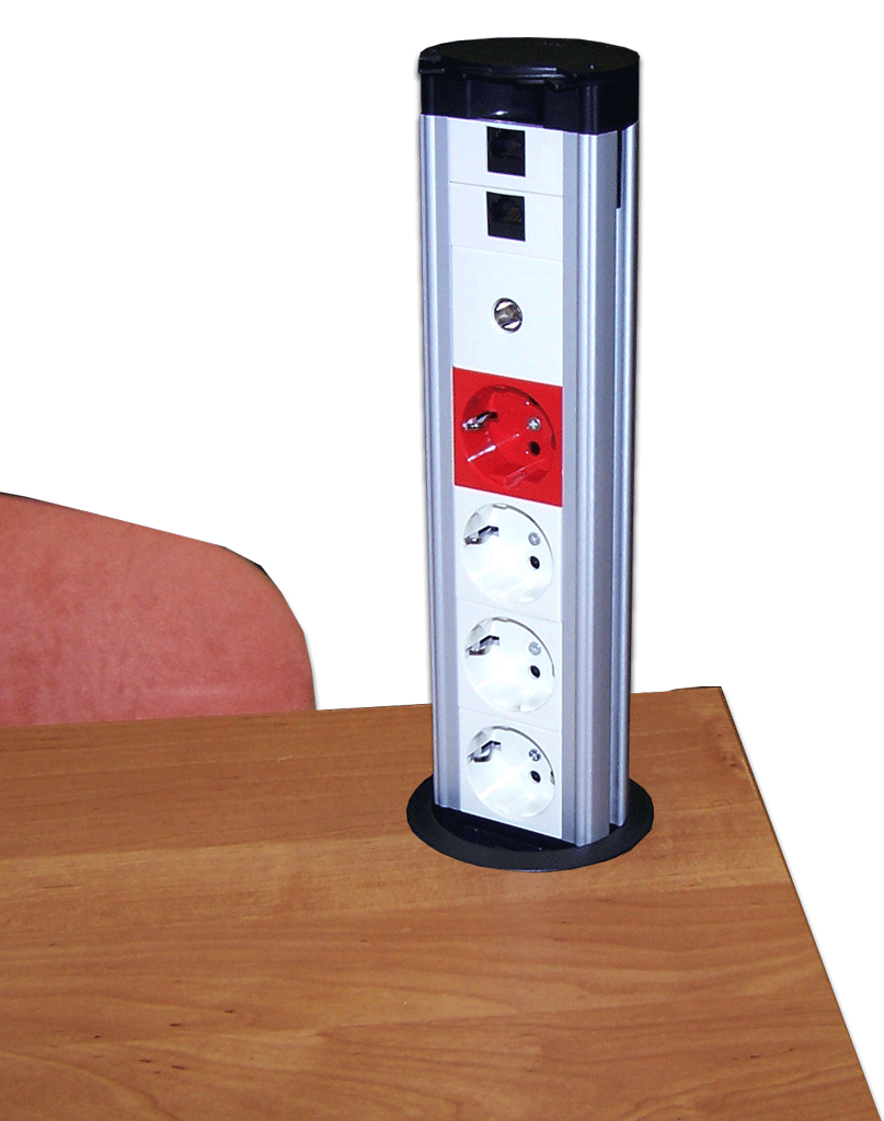 | Настольная однорядная миниколонна предназначена для организации полноценных рабочих мест (телекоммуникационные порты плюс силовые электрические розетки), или многопользовательских телекоммуникационных розеток непосредственно на рабочих столах.