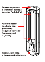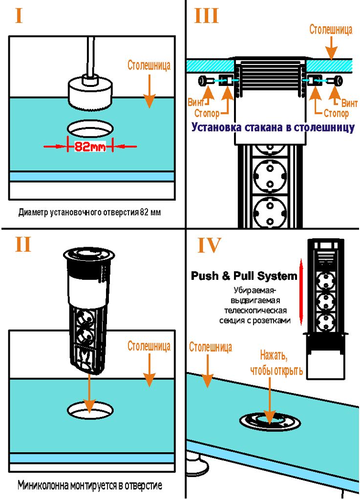 Миниколонна имеет алюминиевый корпус. Корпус миниколонны устанавливается в монтажный стакан, фиксируемый в столешнице при помощи двух стопоров.