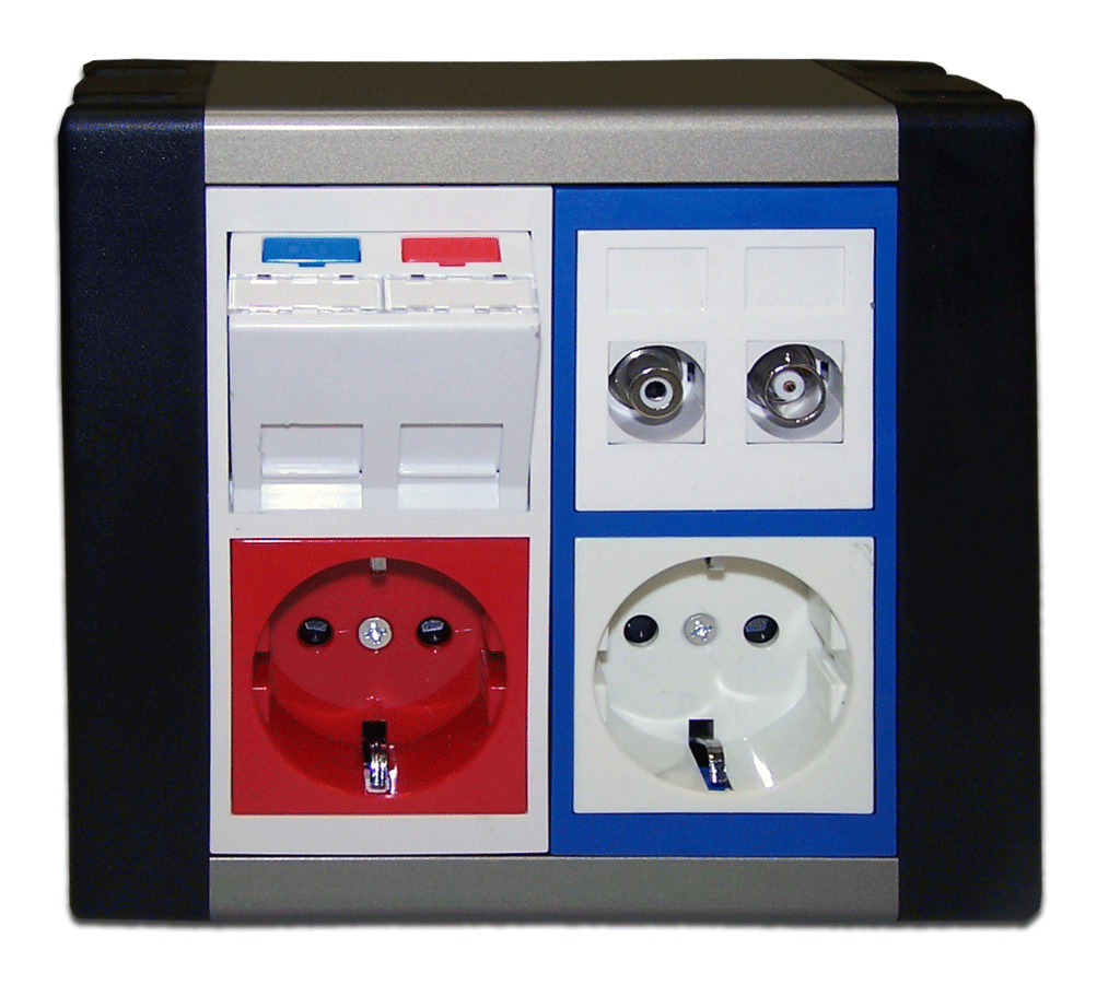 | Настенный двухрядный блок предназначен для организации полноценных рабочих мест (телекоммуникационные порты плюс силовые электрические розетки), или многопользовательских телекоммуникационных розеток.
