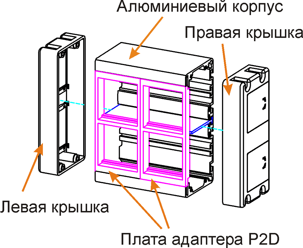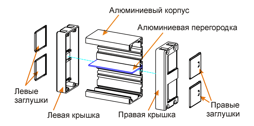 Корпус выполнен из алюминиевого сплава. Снаружи имеет анодированное покрытие. Внутри корпуса установлена съемная алюминиевая перегородка. С боковых сторон корпус закрыт пластиковыми крышками, оснащенными съемными заглушками.