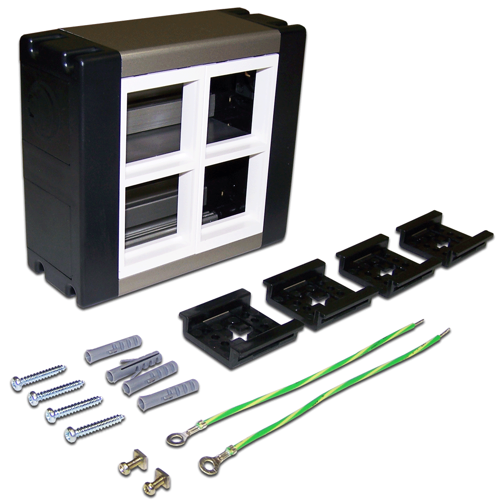 Бокс в базовой комплектации имеет четыре лицевых панели белого цвета для горизонтально ориентированных модулей. При необходимости панели адаптеров могут меняться на платы других цветов (красные или синие), а также на панели с вертикальной ориентацией устанавливаемых механизмов.