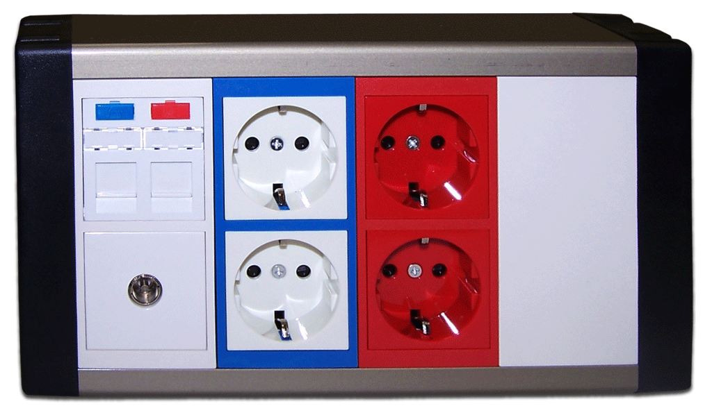 | Настенный двухрядный блок предназначен для организации полноценных рабочих мест (телекоммуникационные порты плюс силовые электрические розетки), или многопользовательских телекоммуникационных розеток.