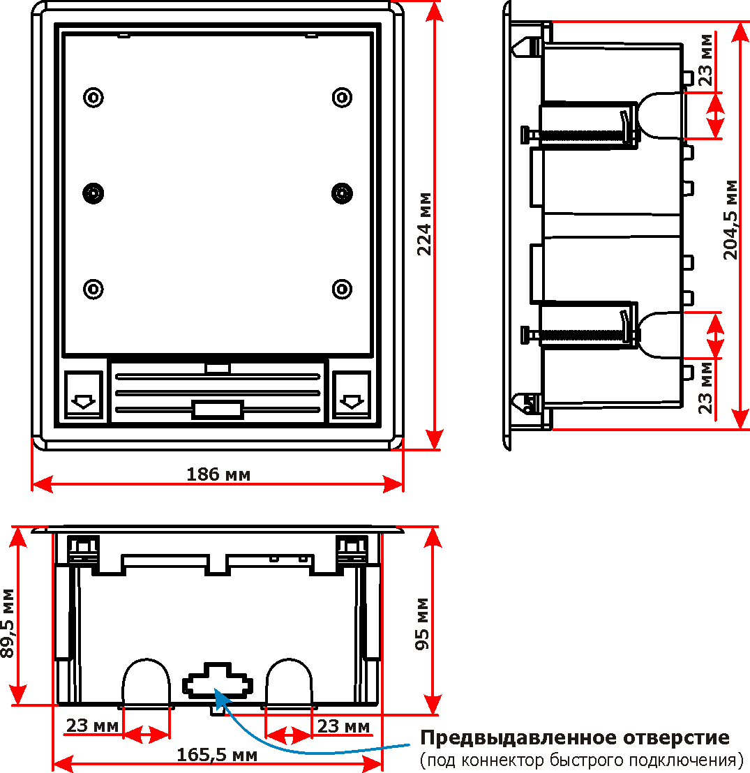 | Напольный двухрядный лючок предназначен для организации полноценных рабочих мест (телекоммуникационные порты плюс силовые электрические розетки), или многопользовательских телекоммуникационных розеток в местах удаленных от стен или колонн, а также в помещениях с открытой планировкой. Лючок имеет 6 посадочных мест под французский стандарт Mosaic 45x45 непосредственно в лицевых панелях (по 2 места в каждой панели). Данная модель в базовой комплектации имеет три лицевых панели белого цвета для горизонтально ориентированных модулей. При необходимости панели адаптеров могут меняться на платы других цветов (красные или синие), а также на панели с вертикальной ориентацией устанавливаемых механизмов.
