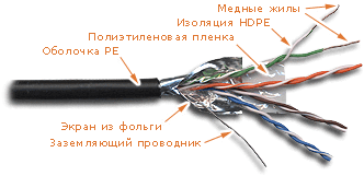 Два проводника, скрученных со специально подобранным шагом, составляют одну витую пару. 4 витых пары обернуты полиэтиленовой пленкой и вместе с медным заземляющим проводником заключены в общий экран из фольги и оболочку из PE (полиэтилен).