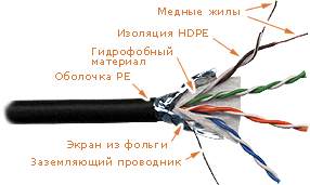 Два проводника, скрученных со специально подобранным шагом, составляют одну витую пару. 4 витых пары обернуты гидрофобным материалом и вместе с медным заземляющим проводником заключены в общий экран из фольги и оболочку из PE (полиэтилен).