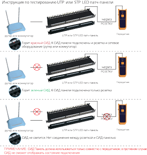 | Патч-панель с индикацией предназначена для удобства определения подключенного оборудования. Каждый порт панели имет светодиод, который при подключении передатчика индицирует состояние подклчюения порта патч-панели. Для отображения статуса подключения необходим передатчик LAN-PPi-CHKTOOL