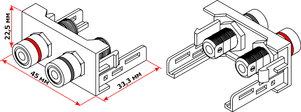 С лицевой стороны панель оснащена разъемами ВС-043 (с красной и черной маркировкой полярности) для подключения разъемов типа "banana plug", а также U-образных клемм под прижимную гайку. Фиксация жил подводимого кабеля с тыльной стороны панели осуществляется при помощи зажимных винтов.