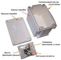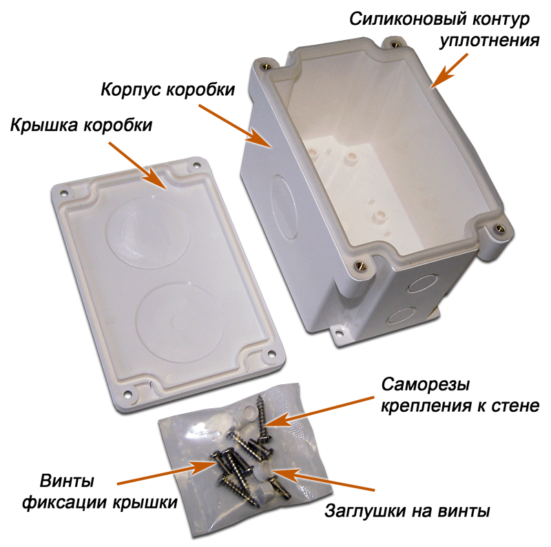 В комплекте коробки имеются винты для фиксации крышки, заглушки на установленные винты, а также саморезы для крепления коробки к стене.