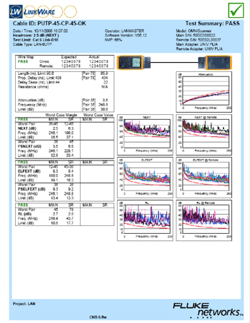 | Длина кабельной линии - 90 метров. Линия оконцована с одной стороны патч-панелью, с другой стороны стандартным кейстоуном кат.6.Кабель смотан в бухту. Разрыв точно посередине. Полученные результаты:- Запас по затуханию: 3,6 Дб