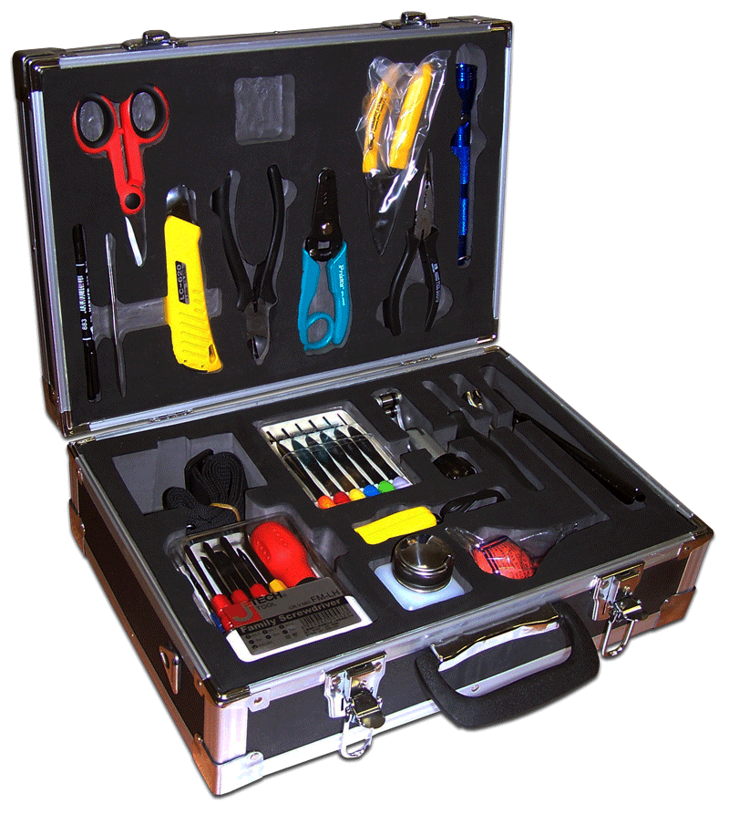 Набор инструмента предназначен для монтажа оптического кабеля любого типа. Инструменты, входящие в набор, позволяют производить операции по обрезке и разделке кабеля, зачистке оптических волокон, подготовке их к скалыванию и последующей терминации. В наборе также есть инструмент для сборки/разборки оптических кроссов или муфт. Для удобства хранения и транспортировки инструменты поставляются в алюминиевом кейсе с укладочной поролоновой формой.