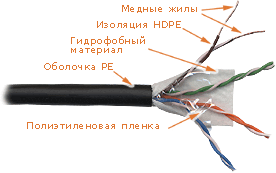 Два проводника, скрученных со специально подобранным шагом, составляют одну витую пару. 4 витых пары обернуты полиэтиленовой пленкой, гидрофобным материалом и заключены в общую оболочку из PE (полиэтилен).