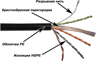 Два проводника, скрученных со специально подобранным шагом, составляют одну витую пару. Пары отделены друг от друга крестообразной перегородкой увеличивающей переходное затухание между парами. 4 витых пары и перегородка обернуты полиэтиленовой пленкой и заключены в оболочку из полиэтилена (PЕ).