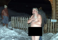 И вот уже нестройные напевы понеслись под своды трюма корабля, гости начали накладывать себе на горячее рыбу с гарниром из мяса, а самые идейные клиенты продолжали засыпать организаторов семинара идеями по новой и перспективной продукции. Но чу… То тут, то там стали слышаться фразы «идите в баню» и вскоре дружная толпа закадычных коллег-конкурентов, укомплектованная 50-ю литрами разливного пива, побрела в царство пара и веников. Немногочисленные противники запарки остались встречать весну, отмеряя наступление очередных 10 минут ее правления гулким стуком стаканов. Сибирская баня! Передать эти ощущения также невозможно, как рассказать негру, что такое снег. Махнув пол-стакана пива, заходишь в парную и оказываешься в окружении разгоряченных и поддающих мужиков. С трудом отсидев положенный срок и получив напутственный шлепок веником, выскакиваешь на 20-градусный мороз, чтобы с помощью чистейшего снега привести температуру тела в состояние, совместимое с жизнью. С легкой головой и на парящих ногах возвращаешься в предбанник и сразу же активно включаешься в увлекательную беседу, о сути которой не имеешь ни малейшего представления.